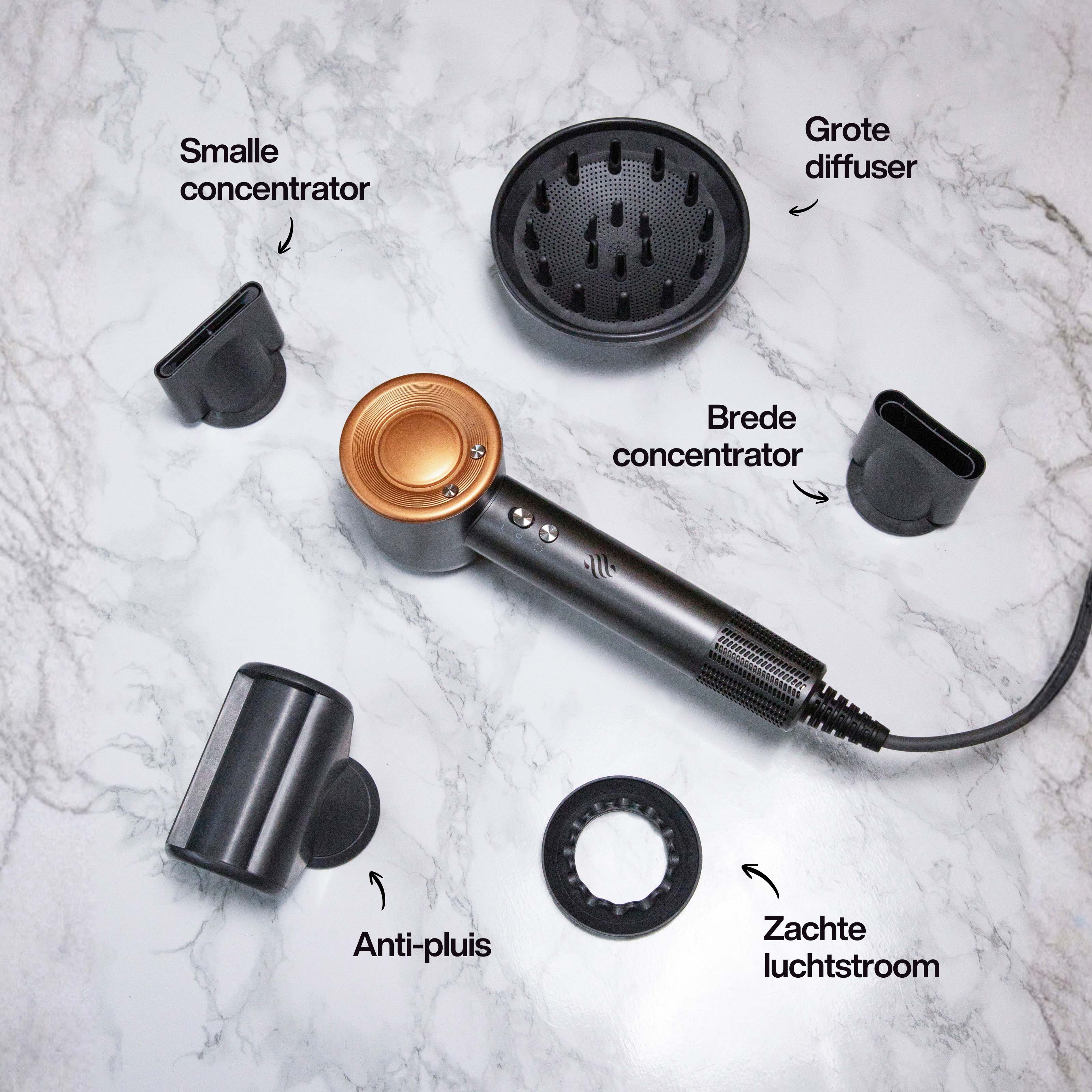 Contents of the package: Hair dryer, manual, five attachments Color: Black Dimensions: 10 x 8.5 x 25 cm (L x W x H)
